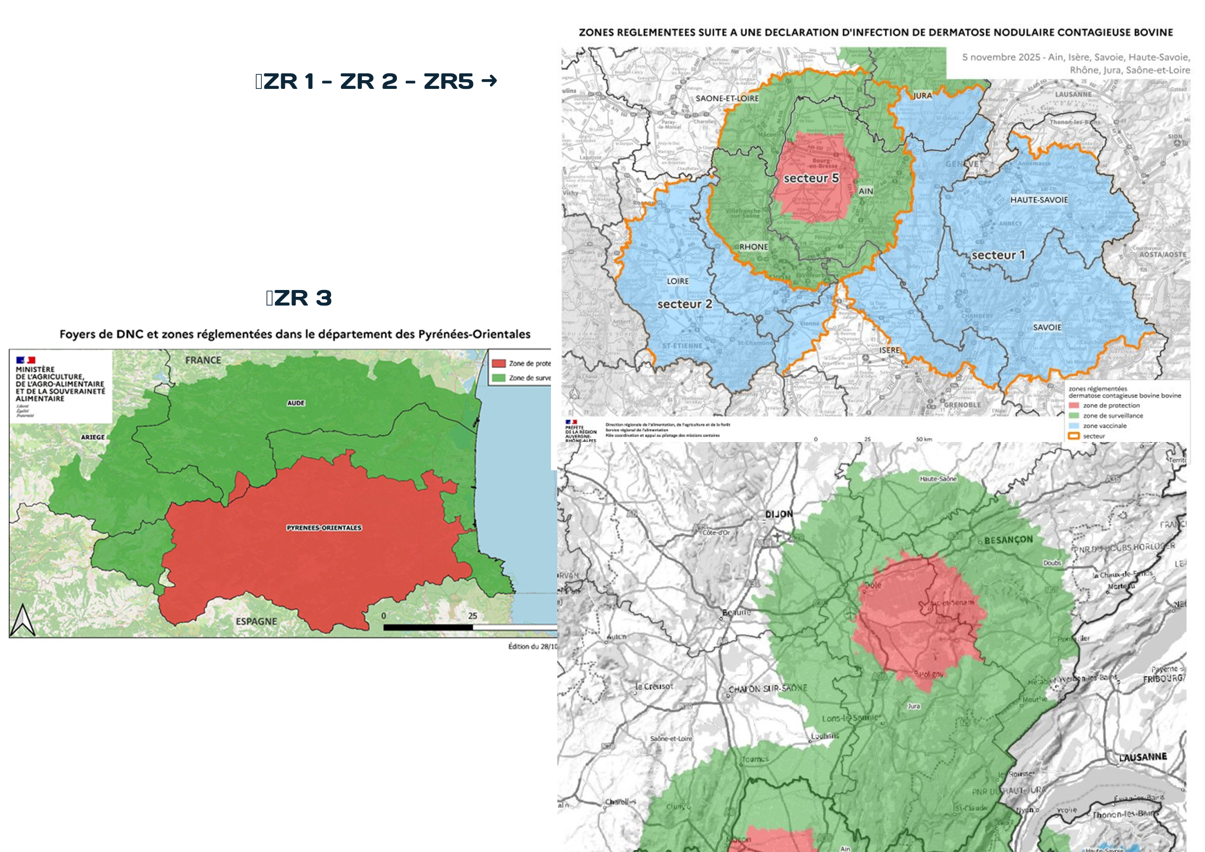 - Liste des communes dans la zone vaccinale de la ZR1 (en bleu à droite sur la carte), au sein de laquelle les mouvements d'animaux sont possibles sous certaines conditions: cliquez-ici ;