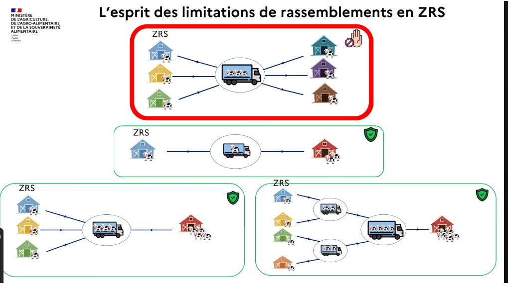 ⛔Nous vous rappelons que la participation à des rassemblements de bovins (foire, concours, etc.) et l'acheminement d'animaux (retour de pension, achat, échange de copropriété) depuis ces zones sont rigoureusement interdits afin de limiter au maximum la diffusion de la maladie.