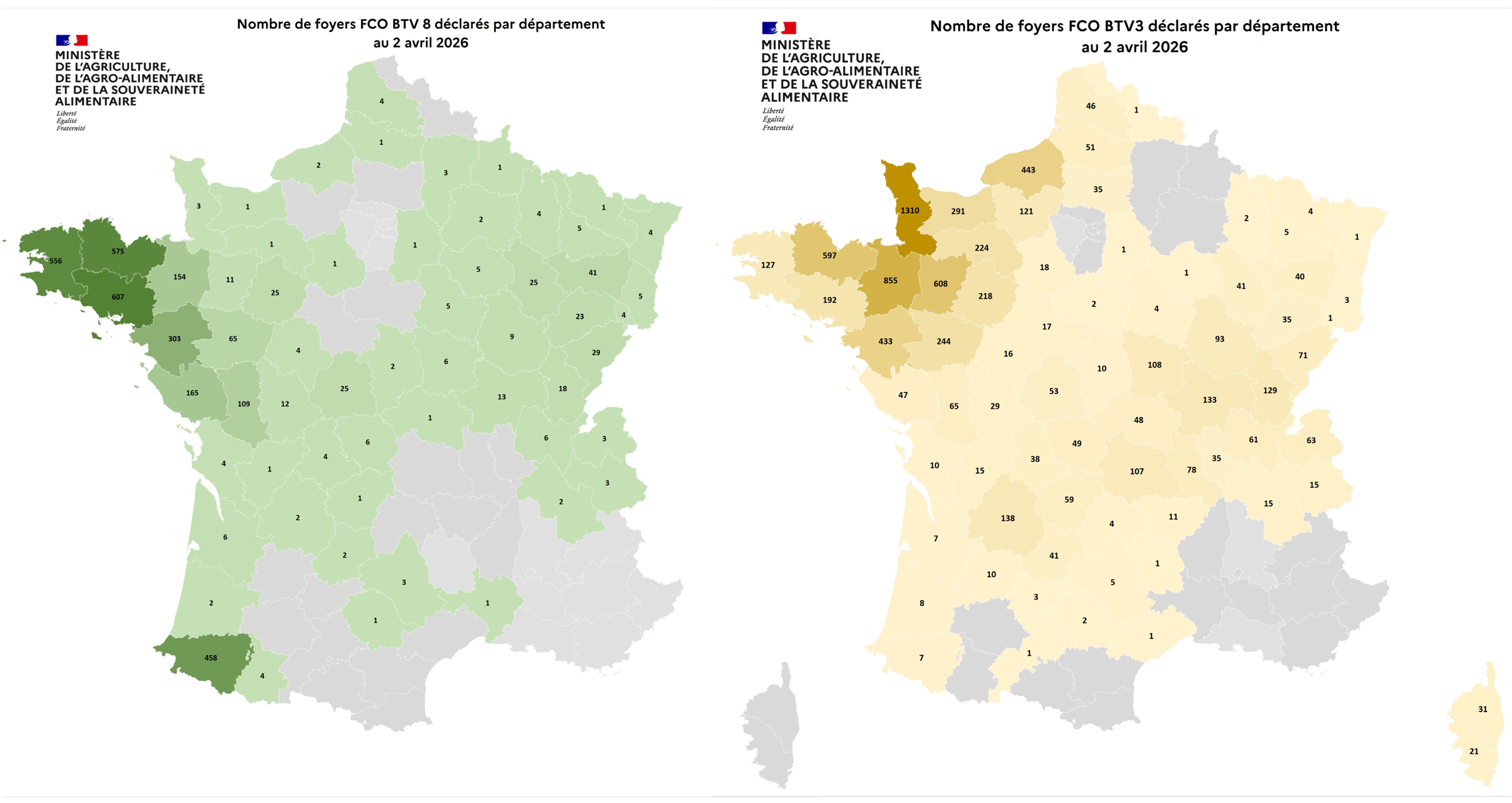 Au 2 avril 2026, le Cantal dénombre, 4 foyers de FCO 3 et aucun de FCO 8