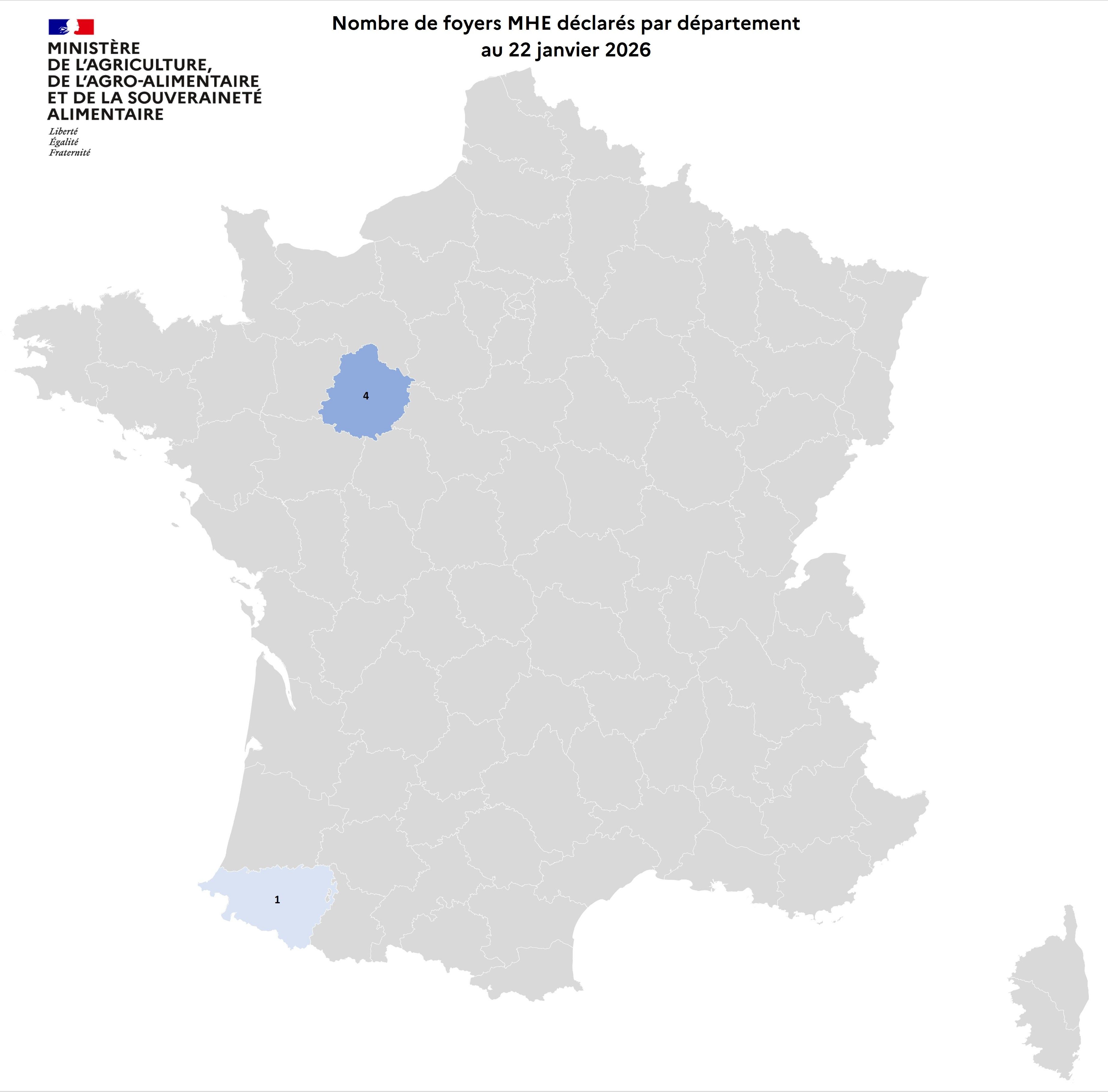 Du 1er juin 2025 au 22 janvier 2026, 5 foyers de MHE ont été recensés dans les Pyrénées-Atlantiques (64 - 1 foyer) et la Sarthe (72 - 4 foyers).