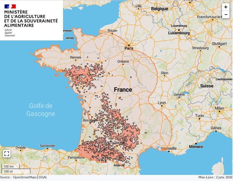 Du 1er juin 2025 au 2 janvier 2026, 5 foyers de MHE ont été recensés dans les Pyrénées-Atlantiques (64 - 1 foyer) et la Sarthe (72 - 4 foyers).